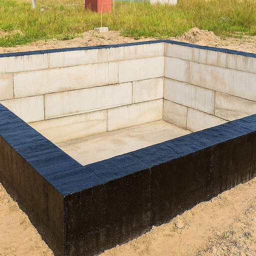 Выполняется внешняя гидроизоляция фундамента и обратная засыпка с послойным трамбованием для защиты от промерзания и смещения.